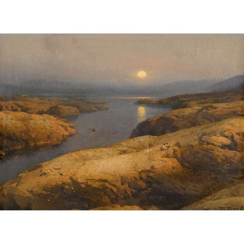 HERMANN HERZOG (AMERICAN/GERMAN 1831-1932) SUNRISE OVER THE WATER WITH DUCKS