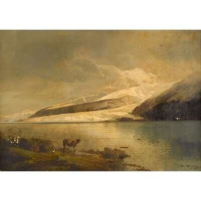 HERMANN HERZOG (AMERICAN/GERMAN 1831-1932) MOOSE IN A GLACIAL LANDSCAPE