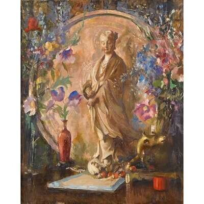 EDMUND CHARLES TARBELL (AMERICAN 1862-1938) STILL LIFE WITH FLOWERS AND STATUE