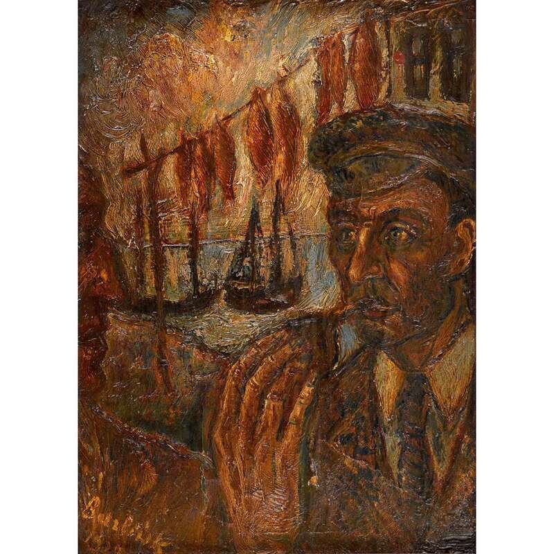 DAVID DAVIDOVICH BURLIUK (AMERICAN/UKRANIAN 1882-1967) PIPE SMOKER WITH HARBOR BEYOND