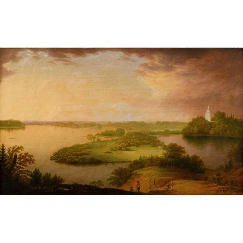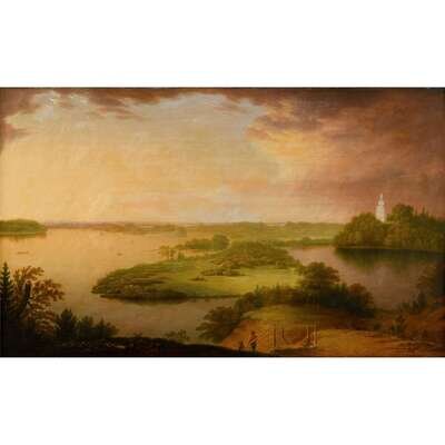 CHARLES B. LAWRENCE (AMERICAN 1790-1864) LANDSCAPE WITH CHILDREN, DOG, AND DISTANT BOATS
