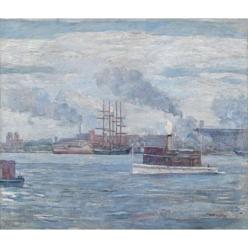 HENRY BAINBRIDGE MCCARTER (AMERICAN 1864-1942) STEAM SHIPS IN AN INDUSTRIAL HARBOR