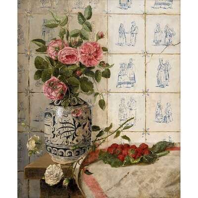 F. DE WIT (BELGIAN 19TH-20TH CENTURY) FLORAL STILL LIFE WITH TILED WALL