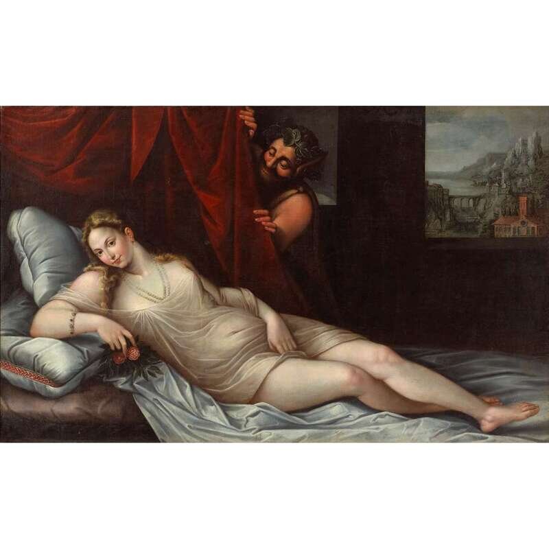 FOLLOWER OF TITIAN (TIZIANO VECELLI) (ITALIAN CA. 1485-1576) RECLINING VENUS WITH SATYR