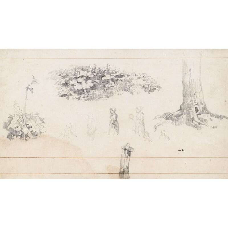 THÉODORE ROUSSEAU (FRENCH 1812-1867) SKETCH OF PLANTS, TREES, AND FIGURES