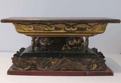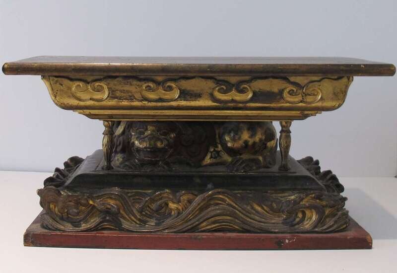 A Chinese gilded and lacquered wood platform base carved to show a fu lion above a turbulent sea 19th century