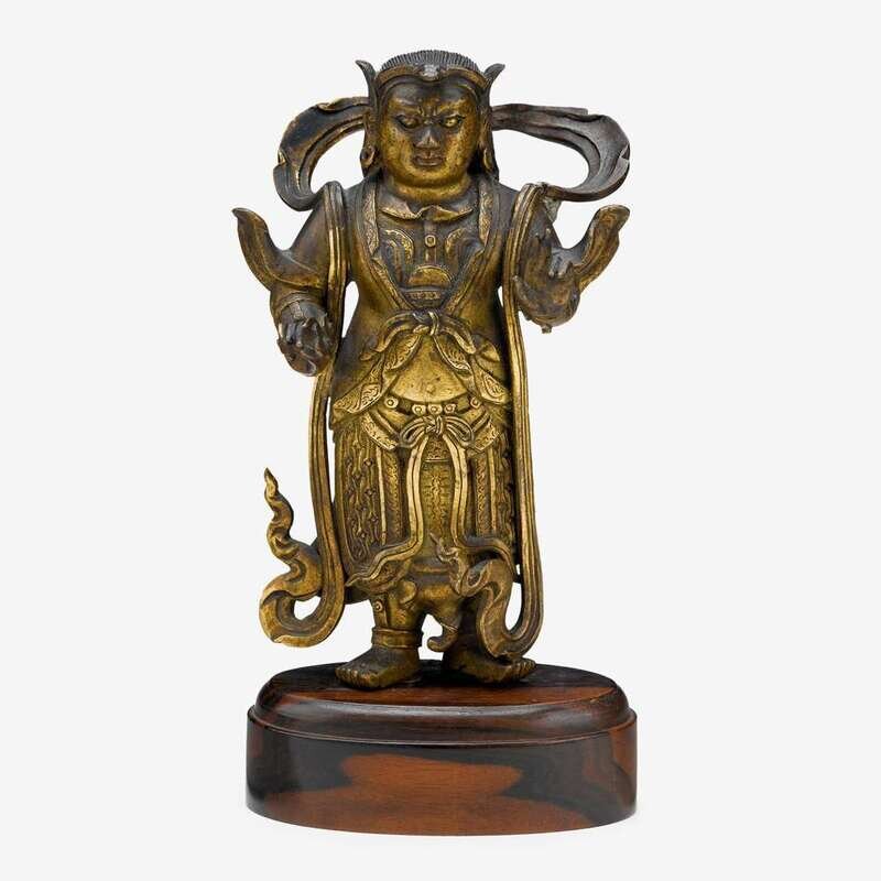 A Chinese gilt bronze figure of Virudhaka in flowing robes and armor late ming dynasty