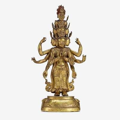 A Sino-Tibetan gilt bronze figure of standing Avalokiteshvara inlaid with gems 18th century