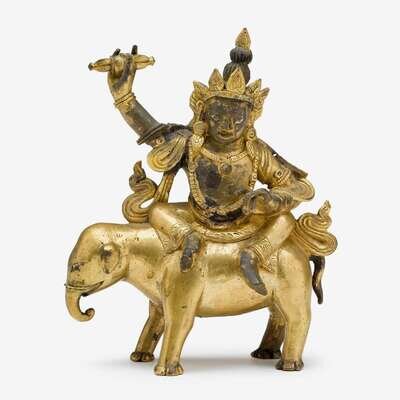 A rare and diminutive Sino-Tibetan gilt bronze figure of Vajrapani seated on elephant 18th century