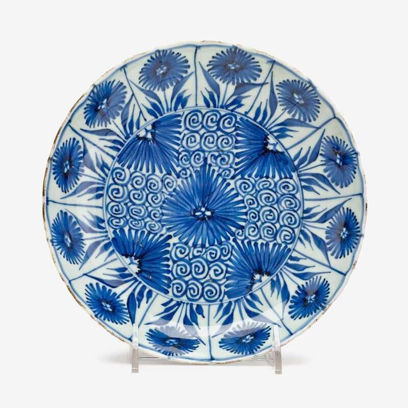 A Chinese blue and white floral decorated barbed rim porcelain dish kangxi period