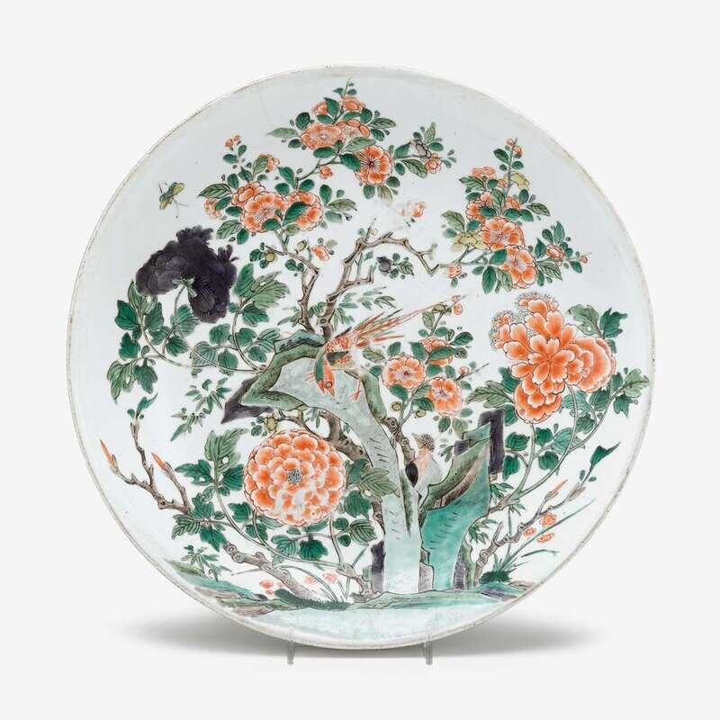 A Chinese famille verte porcelain charger with an interior showing a magpie in a garden of peonies artemisia leaf mark, kangxi period