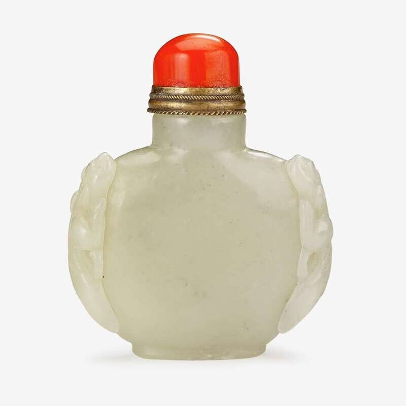 A Chinese carved celadon jade snuff bottle with coral lid