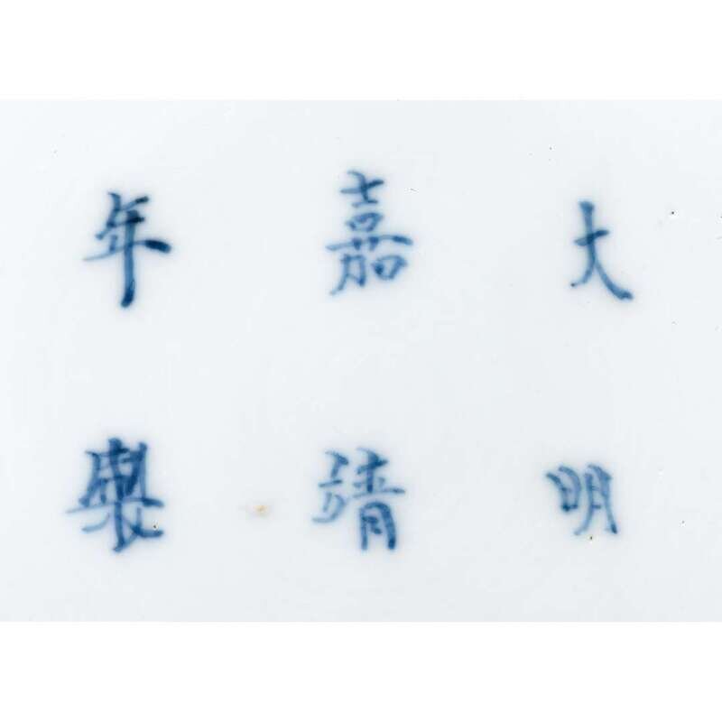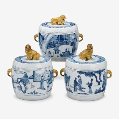 A pair of Chinese blue and white porcelain drum form lidded jars with gilded lion finials pair with jiajing six character marks, kangxi period