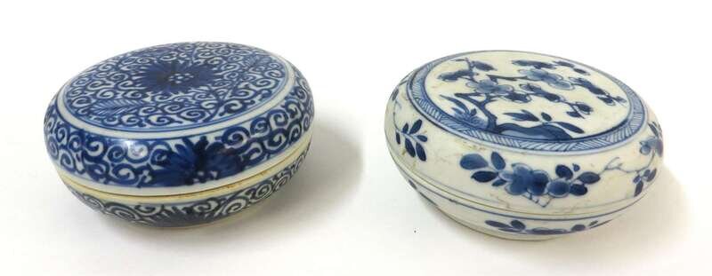 A pair of Chinese blue and white plum blossom and chrysanthemum circular boxes and covers 17th century