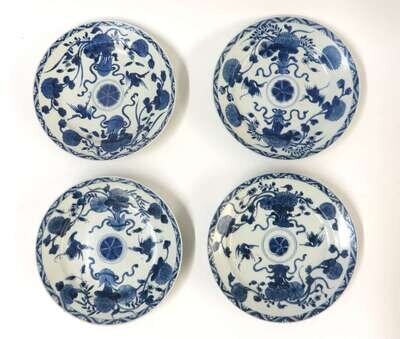 Four Chinese blue and white plates decorated with flowers and ducks 17th century