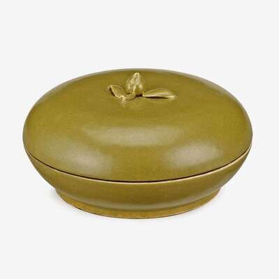A Chinese teadust porcelain circular box with a peach sprig lid obscure six character ming reign mark to base, 18th century
