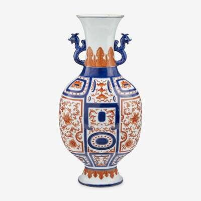 A large and unusual Chinese iron-red decorated and underglazed blue flask form twin-handled vase qianlong six character sealmark and possibly of the period