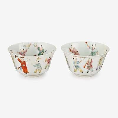 A pair of Chinese famille rose porcelain bowls decorated with children playing instruments jiaqing mark