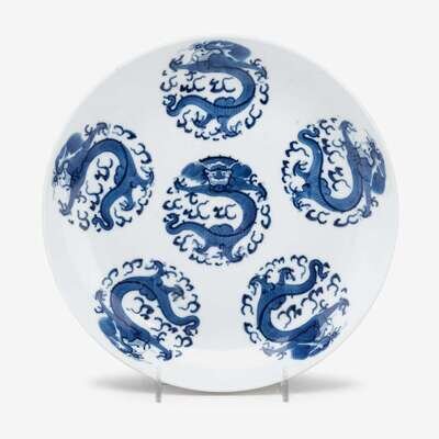 A Chinese blue and white porcelain dragon medallion dish with four small bats to exterior peach mark, daoguang period