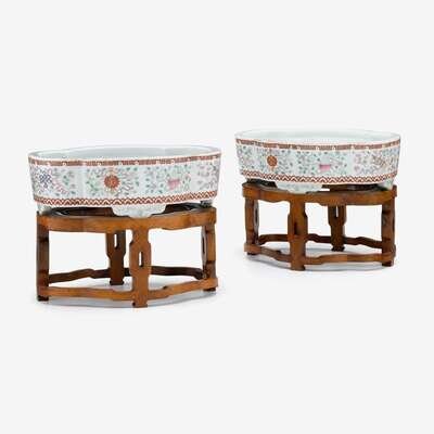 A pair of Chinese porcelain quadrilobed form jardinières enameled with 'bajixiang' motifs shen de tang mark, daoguang imperial workshop