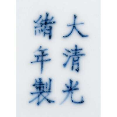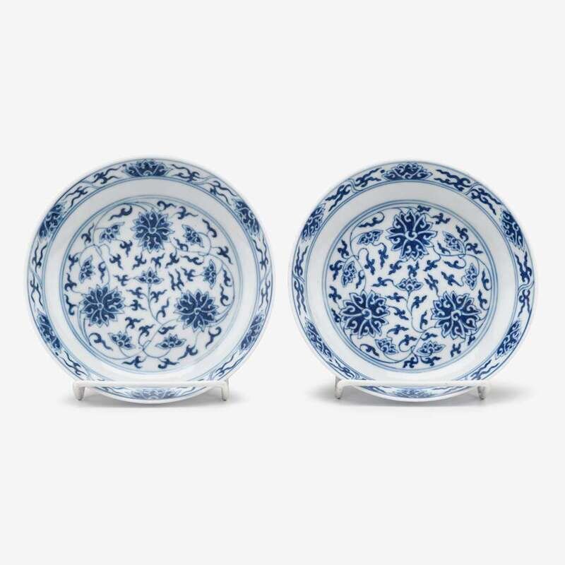 A pair of Chinese blue and white porcelain saucer dishes decorated with lotus blossoms and scrolling vines six character guangxu marks and of the period
