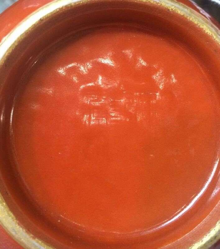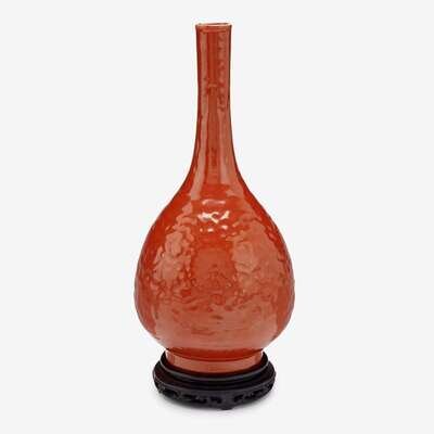 A Chinese coral glazed bottle vase with carved lotus designs, with a wooden stand qianlong incised sealmark, qing dynasty