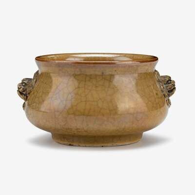 A Chinese Ge-type porcelain censer of caramel glaze adorned with unglazed lion masks to side 19th century