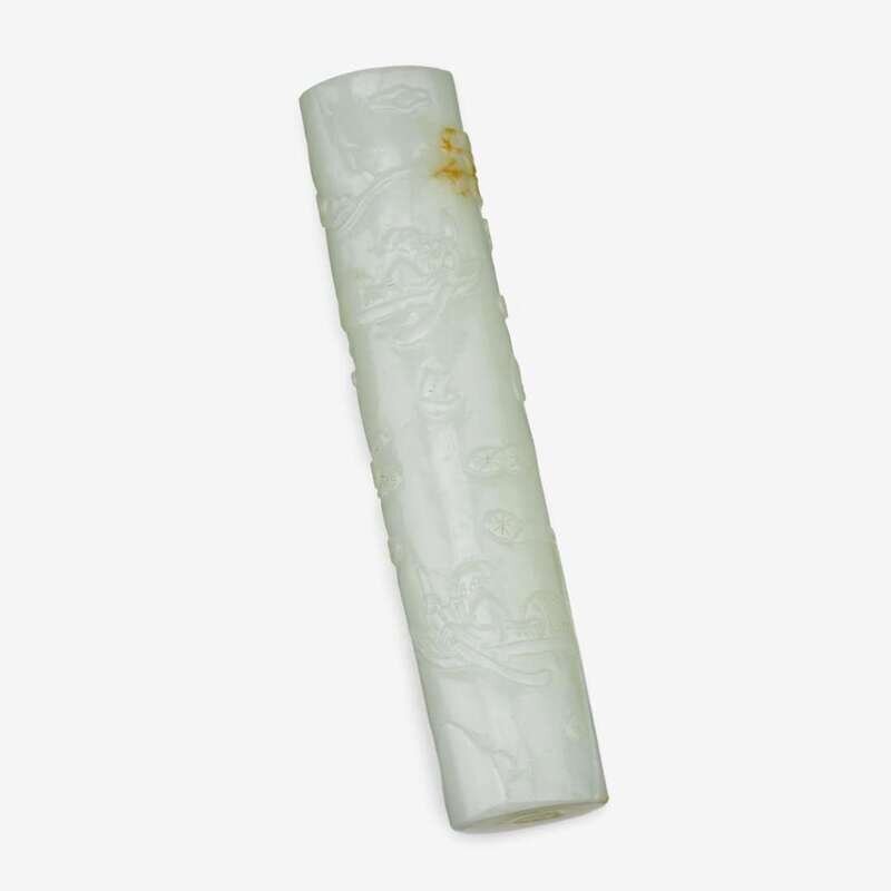 A Chinese white jade handle carved in low relief showing two fishermen amidst mountainous landscape 18th century