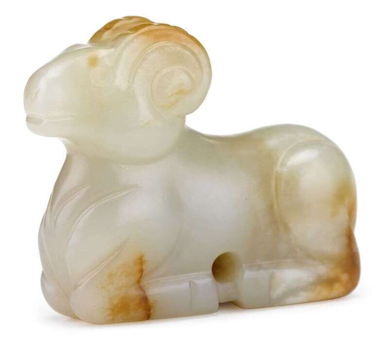 A Chinese mottled jade ram-form toggle of light grey hue with darker inclusions