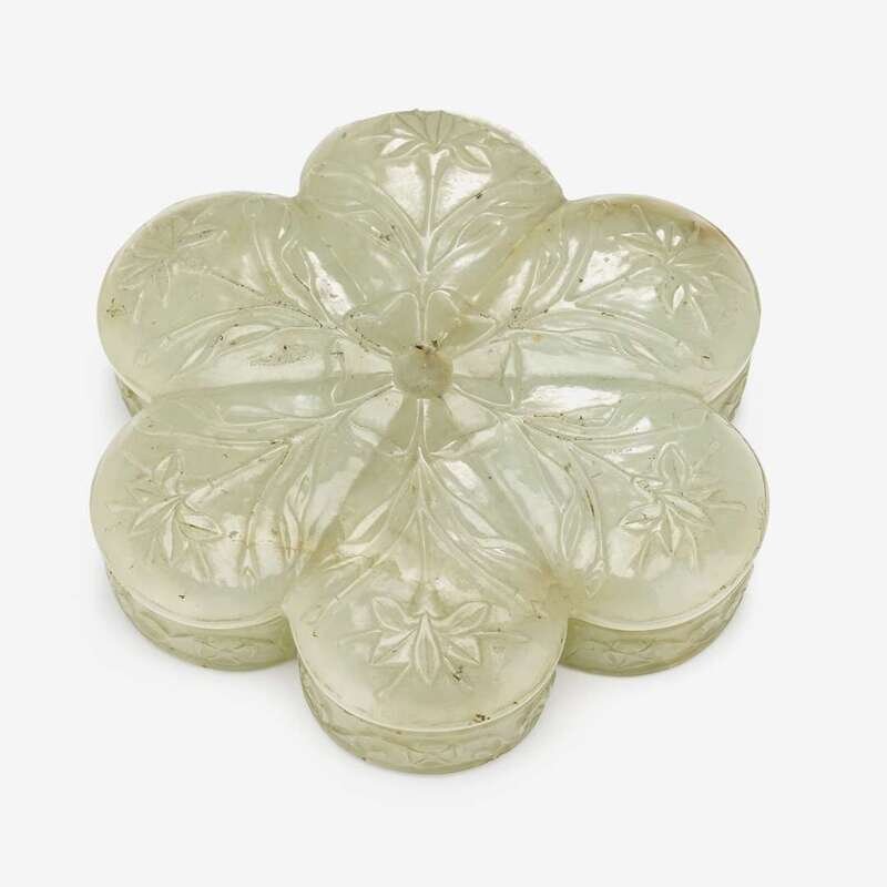 A Mughal style floral formed celadon jade covered box 18th/19th century
