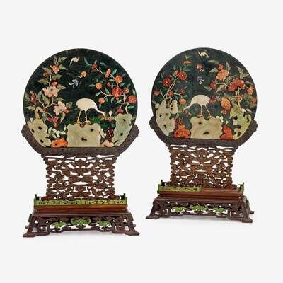 A fine pair of Chinese hardstone inset spinach jade table screens with hongmu stands late qing dynasty