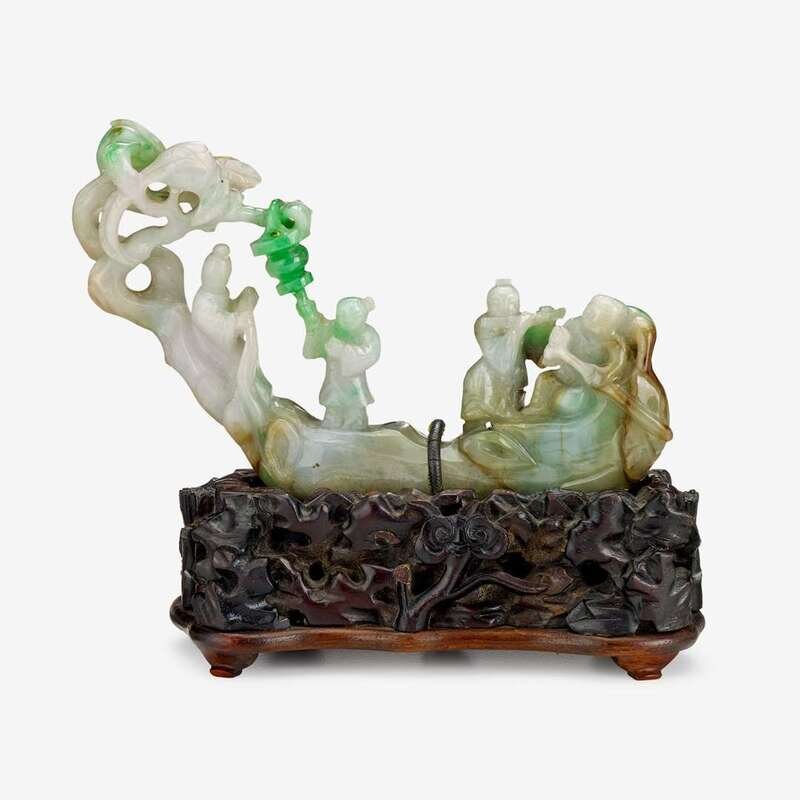 A Chinese jadeite carving of musicians on a tree-shaped boat attached to a wooden stand 19th century