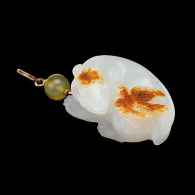 A fine Chinese carved white jade russet bear and bird pendant