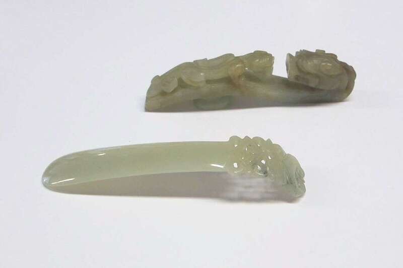 A Chinese celadon jade hair ornament and a celadon jade garment hook qing dynasty