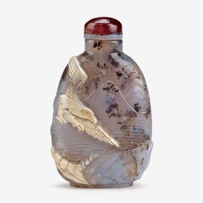 A carved Chinese cameo agate snuff bottle depicting bear to front and eagle verso 19th century