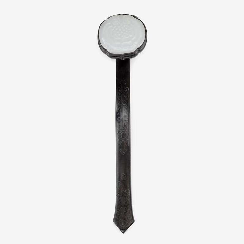A Chinese white jade inset and silver inlaid zitan ruyi scepter 19th / 20th century