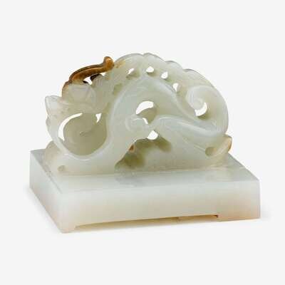A Chinese carved white jade rectangular seal with a sculpted dragon top and sanskrit character base qing dynasty