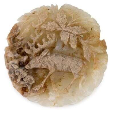 A Chinese white jade circular plaque with deer and lingzhi carving qing dynasty