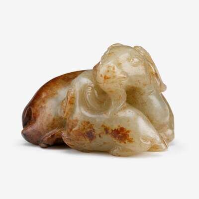 A Chinese carved celadon jade toggle sculpted to show ram and its lamb qing dynasty
