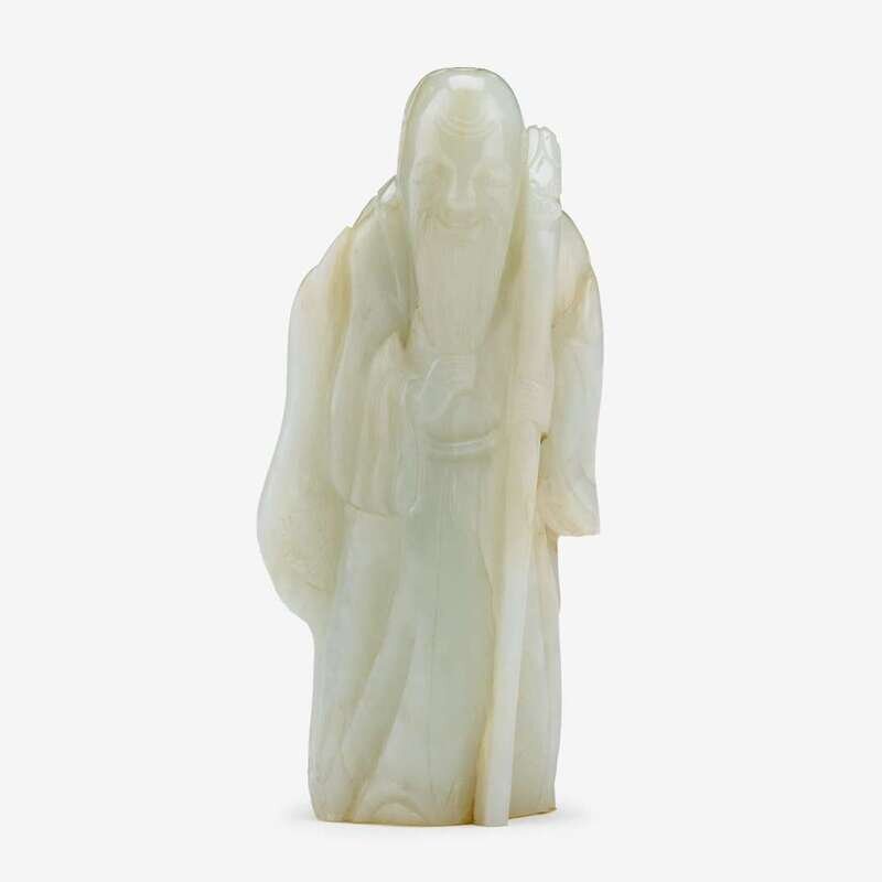 A Chinese carved white jade standing figure of Shoulao flanked by a crane 19th century