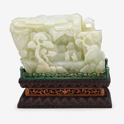 A Chinese celadon jade landscape carved boulder with inscription verso 20th century
