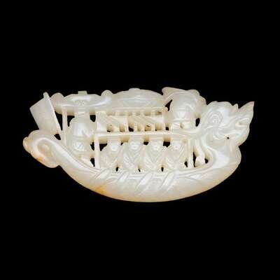 A Chinese white jade open work pendent carved to show a dragon boat qing dynasty