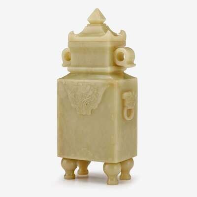 A fine Chinese 'Autumn Mallow' yellow jade archaistic covered vase raised on four feet 19th century