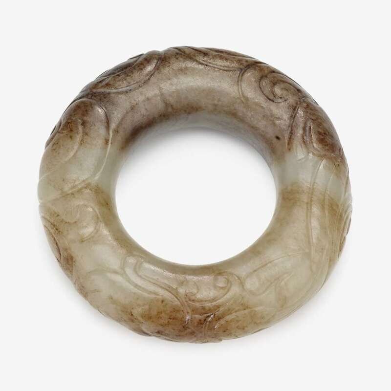 A Chinese white jade carved ring with black inlays