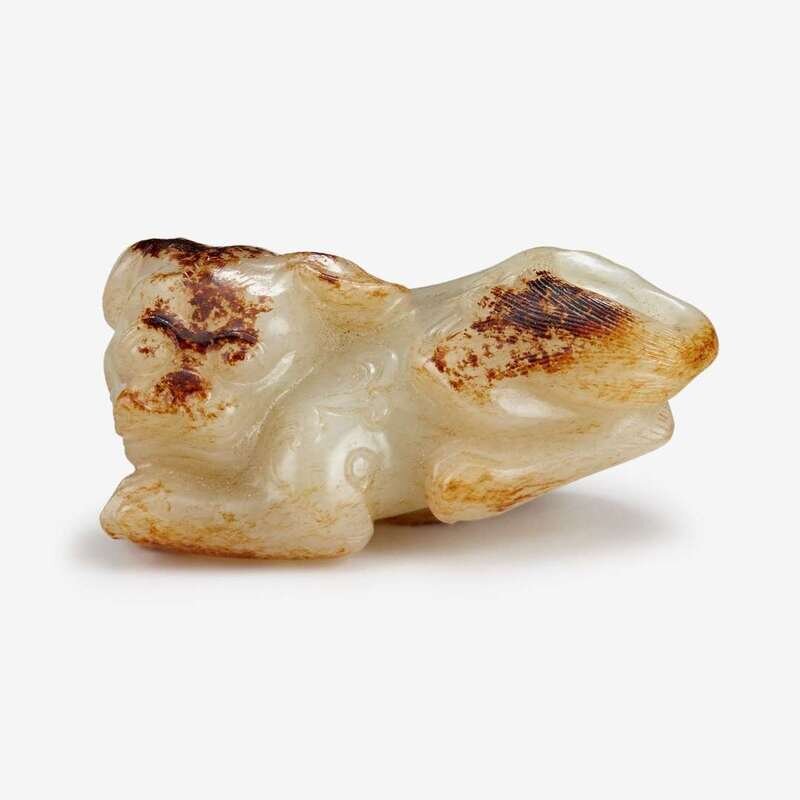 A Chinese white jade carving of a recumbent lion with russet to tail and head late ming dynasty