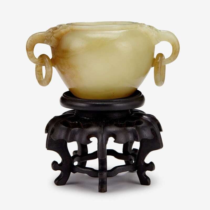 A Chinese yellow jade carved alms bowl with wooden stand qing dynasty