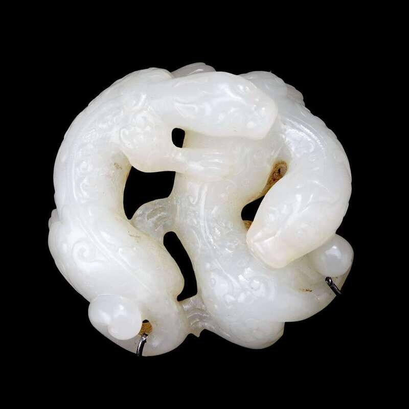 A carved Chinese white jade twin chilong brooch 19th century