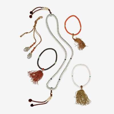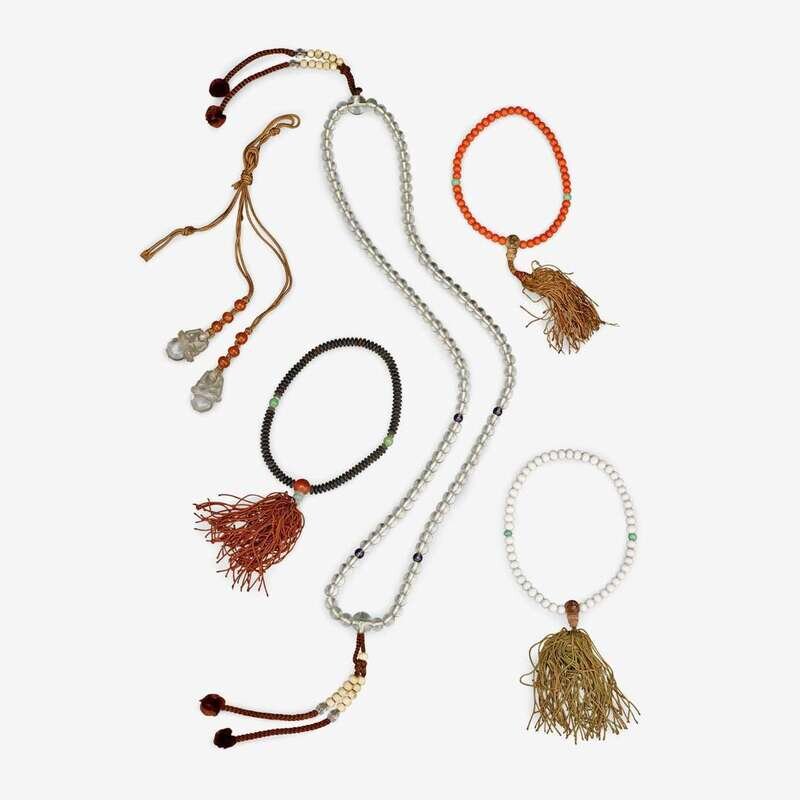 together with three beaded bracelets and a pair of strung crystal and amber pendants.
