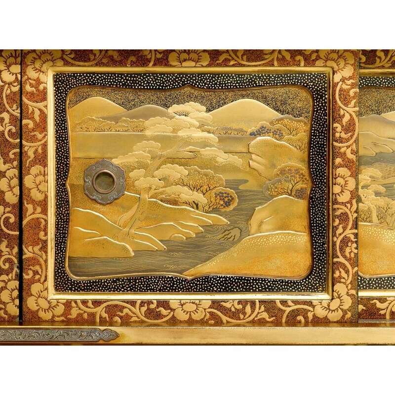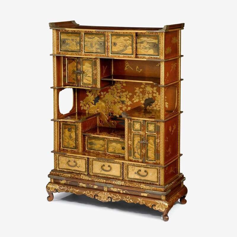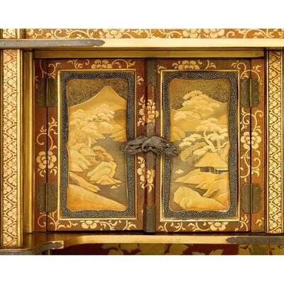 A fine Japanese gold lacquer display cabinet on stand, Kazaridana meiji period