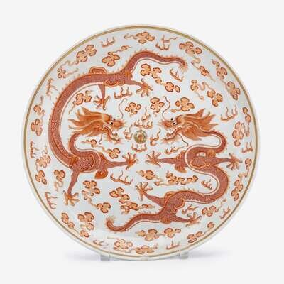 A Chinese iron-red and gilt decorated 'dragon' porcelain charger guangxu six character mark and of the period
